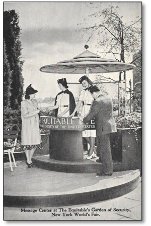 Visitors at the New York World'sFair may keep in touch with their friends through the message center at the Equitable Life Assurance Societies Garden of Security, located in the main exhibit section at the approach to the Empire State bridge. The garden also provides an ideal meeting place. Special programs of general interest are offered daily in its outdoor amphitheater.