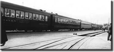 The newest and most modern streamlined passenger equipment being used by American Railroads at the time. Left to right - 2 New Havens, a Pensylvania, A Delaware & Hudson, and one by Budd, not assigned to any railroad, a Pennsylvania Horse car used to thke race horses from one track to another. (October 6, 1940)